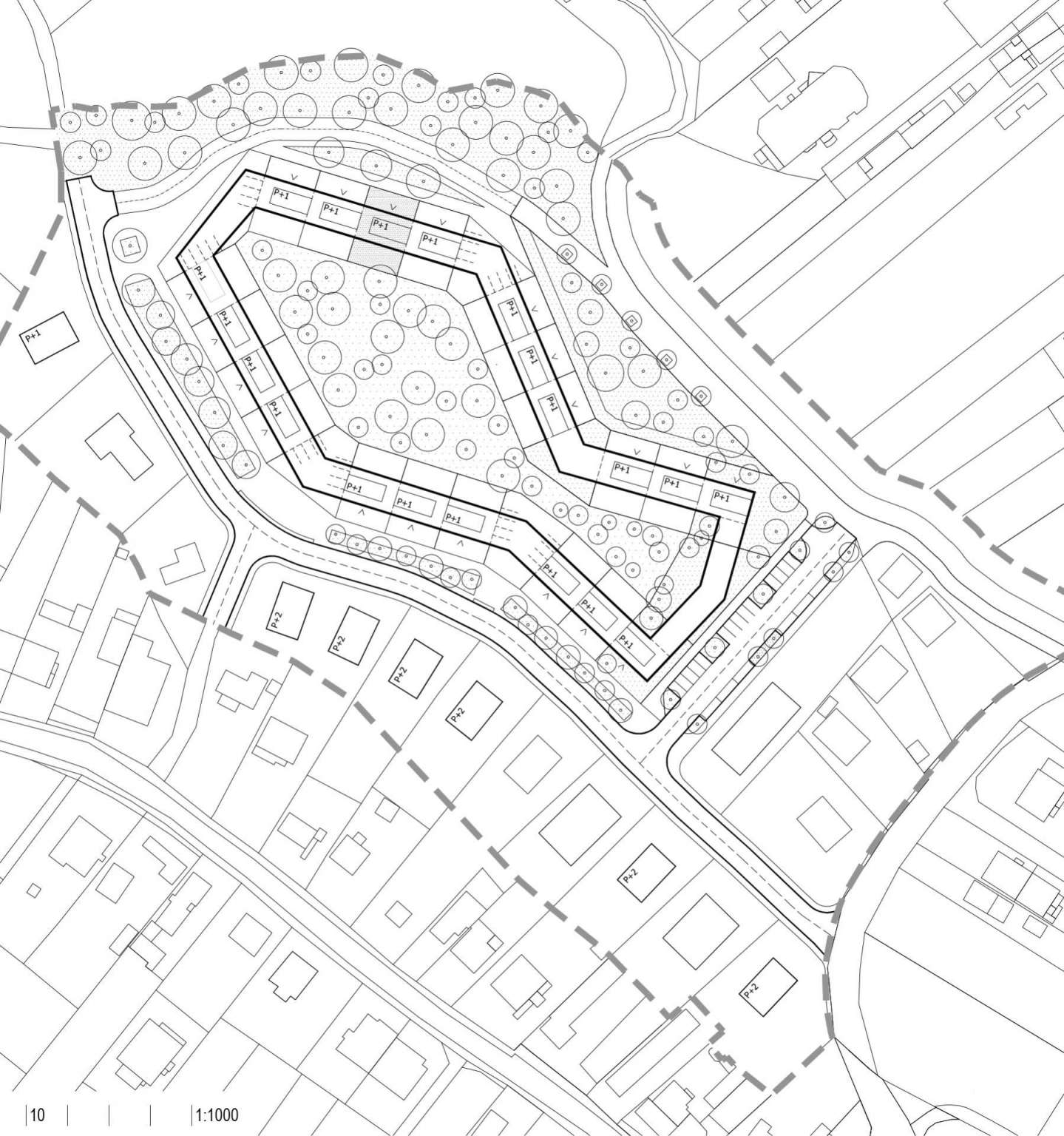 Stambeni nizovi povezani su kontinuiranim krovom, a prošupljeni zajedničkim parkingom. Struktura omeđuje poluprivatni park. Javni park van nizova komplementira poluprivatni park, a kulminira u zasebnim, privatnim vrtovima svake jedinice. Susreti i druženje u parku se događaju točkasto i raspršeno, a između nizova, na zajedničkim parkinzima ugušćeno. Tako su parking i okućnica postali prag, odnosno prijelaz, u kojem se suočava javno, polujavno i privatno, ili zajednica i pojedinac.